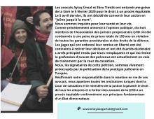 L'une à destination des avocats est plus argumentée (document PDF). Il est demandé de l'imprimer, de la signer, de la scanner et de l'envoyer à l'adresse suivante : serifecerenuysal@gmail.com