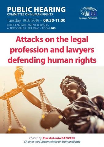 Le sous-comité des Droits de l'homme du Parlement européen (DROI) a organisé, ce 19 février 2019 une audition publique sur le thème Attacks on juridic professions and lawyers defending human rights. J'y ai représente le C.C.B.E. et prononcé le discours que voici. Maîtres Richard Sédillot (F), Fuad Agayev (AFG), Botagoz Jardemalie (KZK) et Nicola McBean (UK).